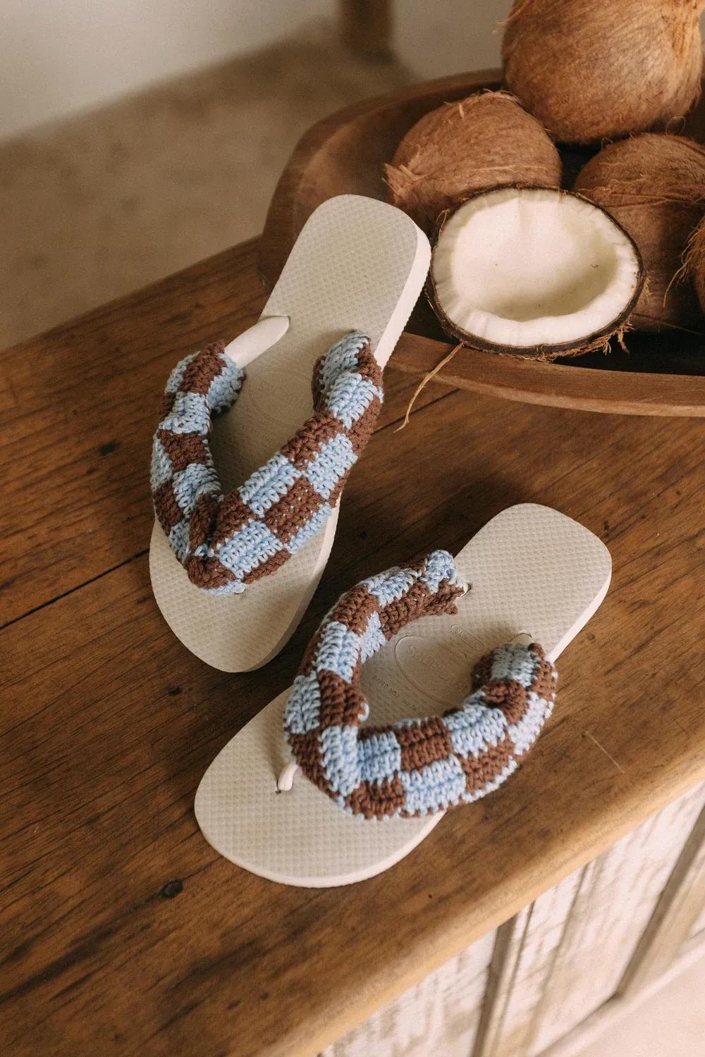 • detalhe em crochê com padronagem xadrez azul e marrom