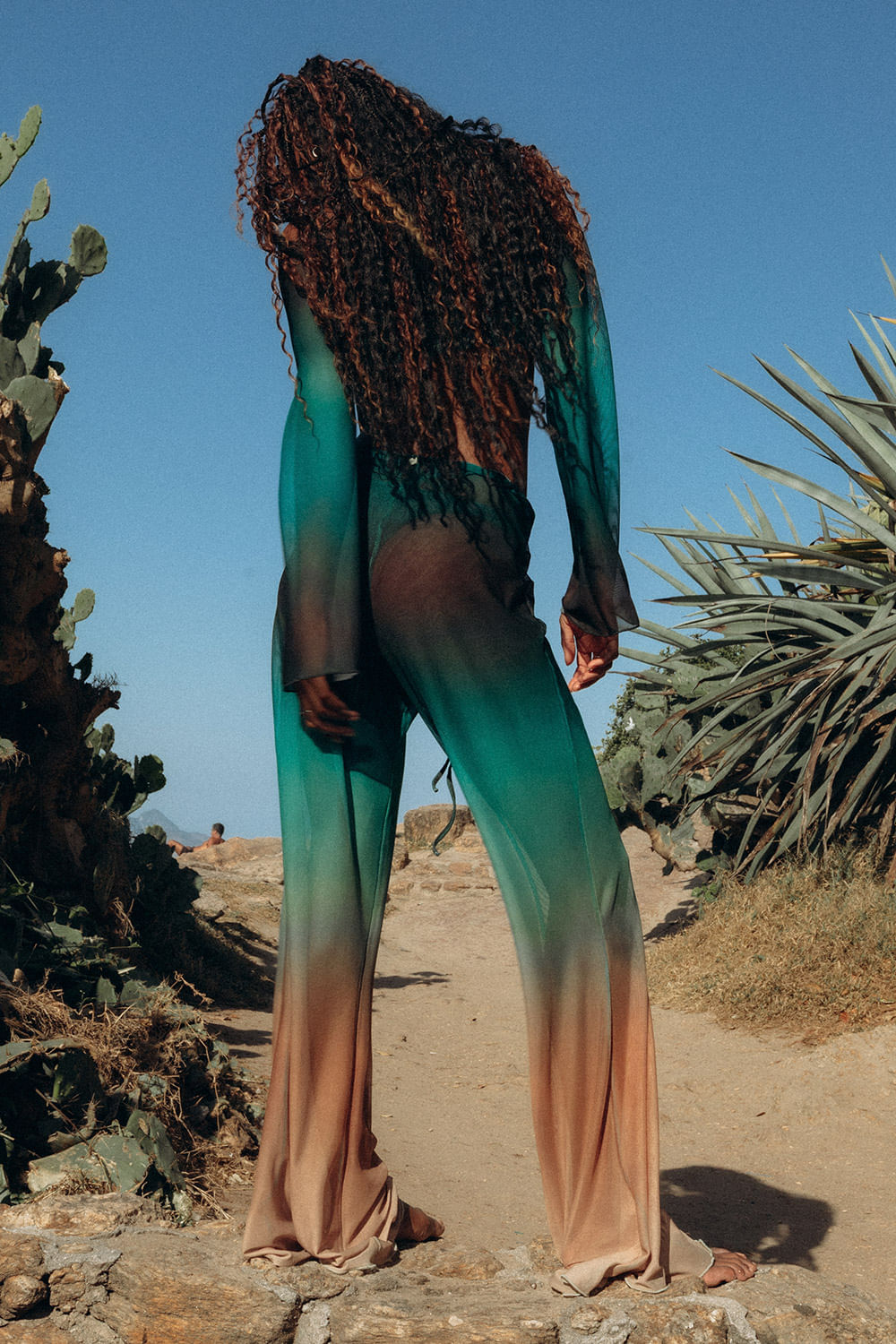 o degradê em tons de verde e areia, com estampa exclusiva, traz a energia natural do verão, perfeito pra usar com calças amplas, saias ou por cima do biquíni.